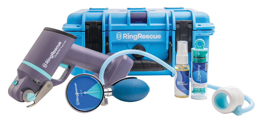 The Ring Rescue Kit is changing how healthcare providers handle this problem, providing a safe, efficient, and minimally traumatic solution that a single clinician can use in minutes, even on tough metals like titanium and tungsten. The Ring Rescue Compression Device™, along with Ring Rescue’s specially formulated lubricant, reduces finger swelling and often allows the ring to be removed without cutting.
